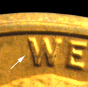 DIE MARKERS: Stage “B“, obverse is MDS – a small die gouge is seen to the left of the word WE.