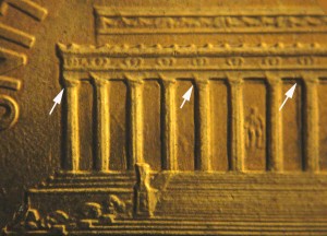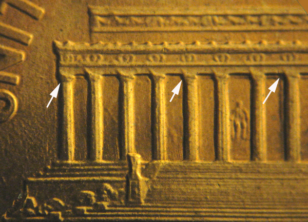DESCRIPTION: Trail lines are seen from the upper right corners of the motto. Also seen are trail lines (nubs) from the top of the letters in STATES OF AMERICA. A nice trail line is seen on the right planter, and on top of all the columns. The statue shows nice distortion as well. Approximate offset direction is 60 degrees.