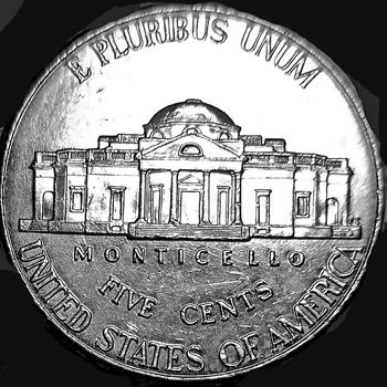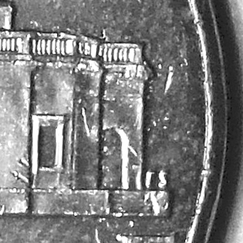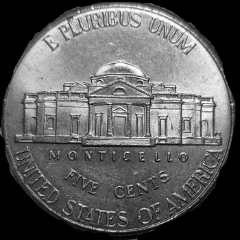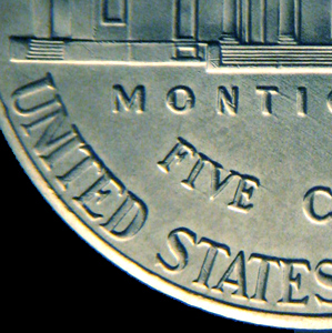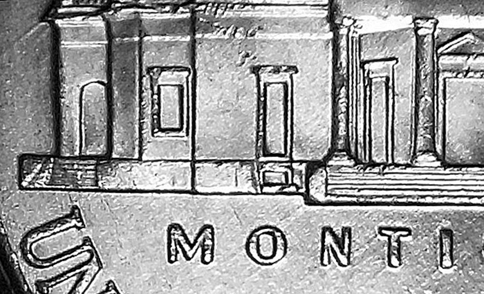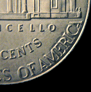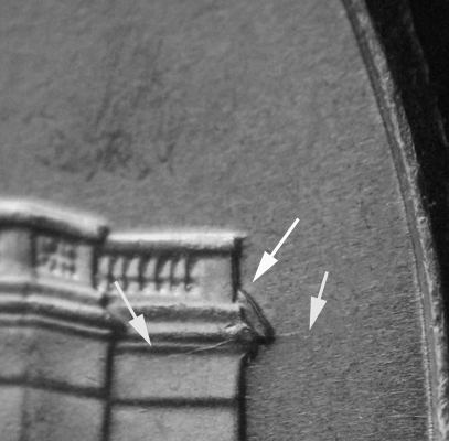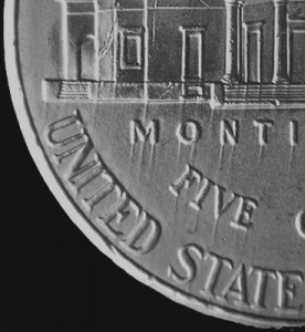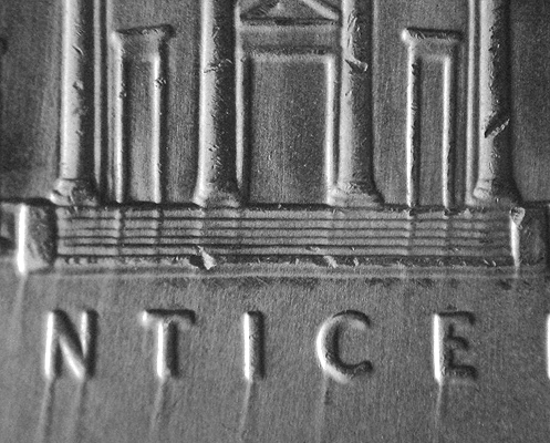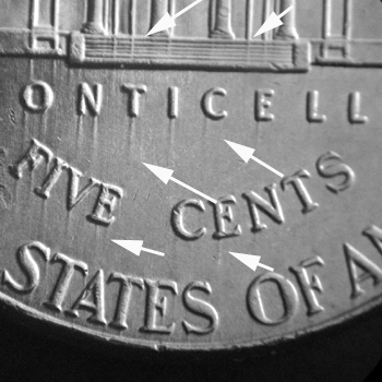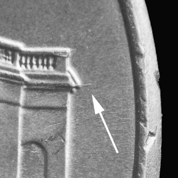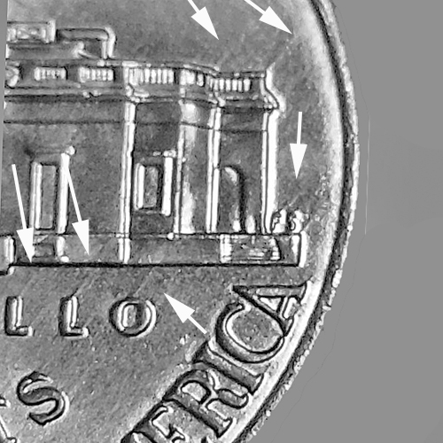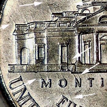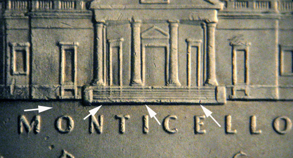 Description: Trail lines are seen from bottom of the windows and columns in the Monticello building. These lines are seen transversing the stairs to the entrance of that building giving the steps a “wavy” appearance. Also seen are trail lines from the words “MONTICELLO, FIVE CENTS” and “UNITED SATES OF AMERICA”. This is the first wavy step reported for the Jefferson nickel. The offset direction is 190°.