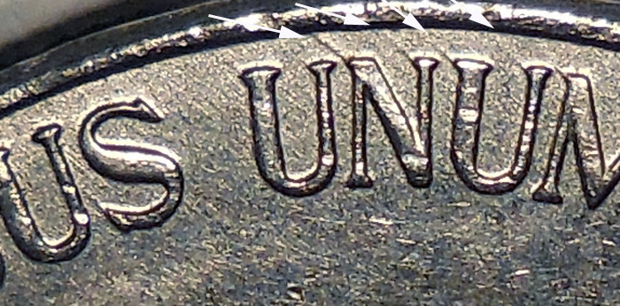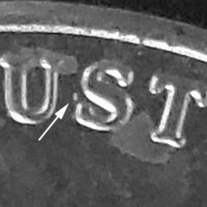 Die Markers: Stage “A” Obverse is MDS – a small die gouge is seen next to the S in TRUST. There is an absence of flow lines seen in this stage.