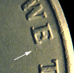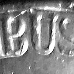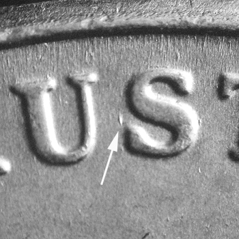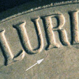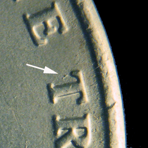 DIE MARKERS: Stage “C“, obverse is LDS – a small die dot can be seen to the right of the base of the first 1 digit in the date. A small die gouge is sen under the U of TRUST.
