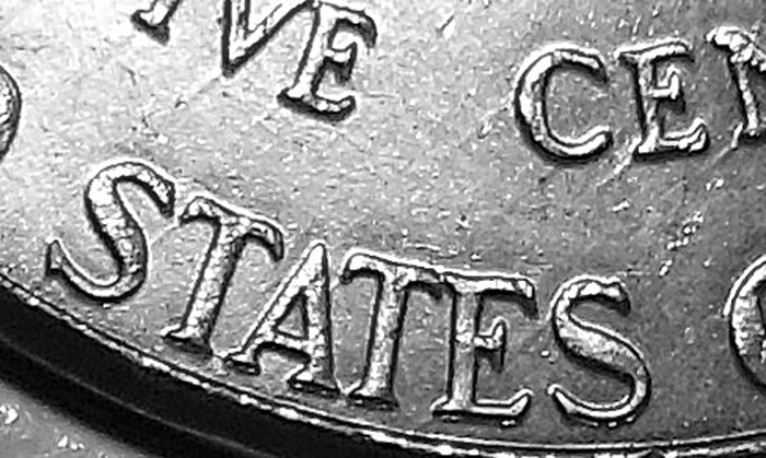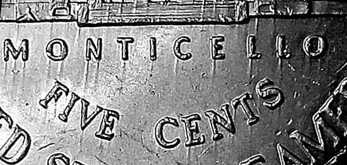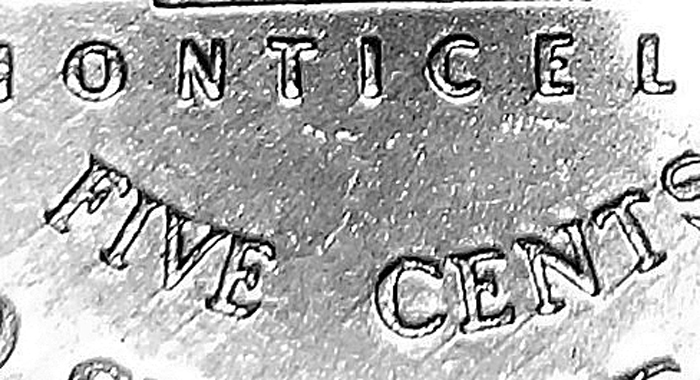 DESCRIPTION: Trail lines are seen from the letter U in PLURIBUS and the first U of UNUM. Also seen are trail lines from the left side of Monticello and the words FIVE CENTS. The offset direction is 330°.