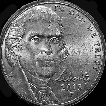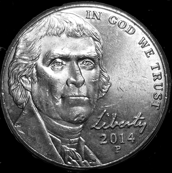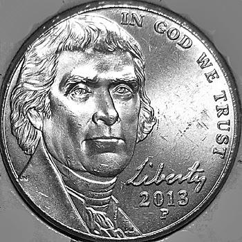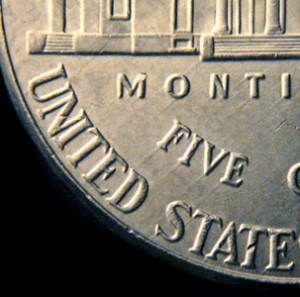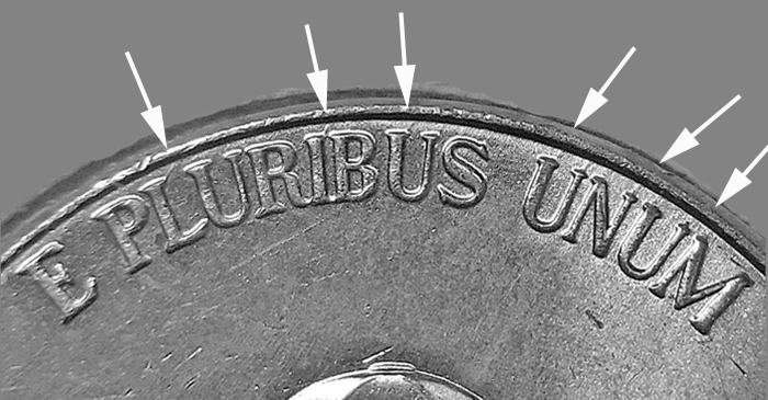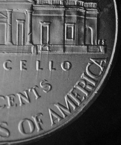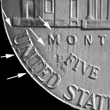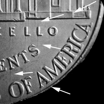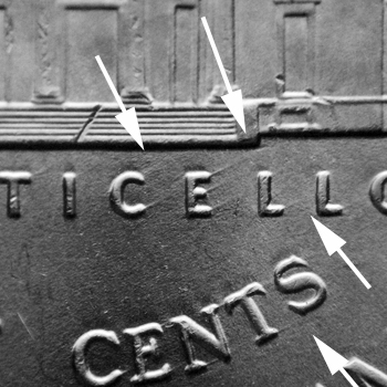 Description: Trail lines are seen from the words PLURIBUS UNUM, the right side of Monticello and the LLO of the word Monticello.
