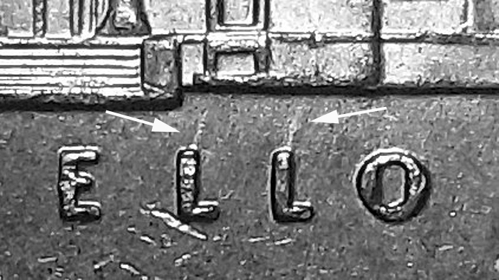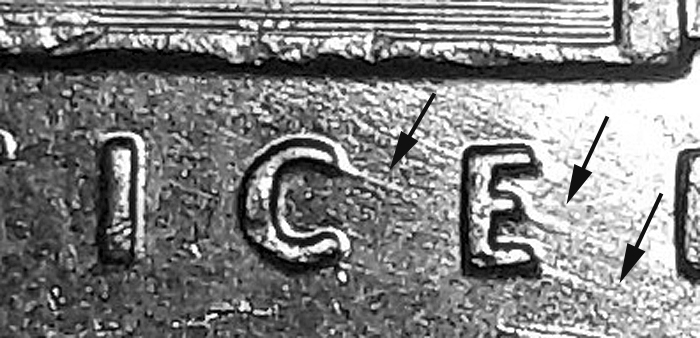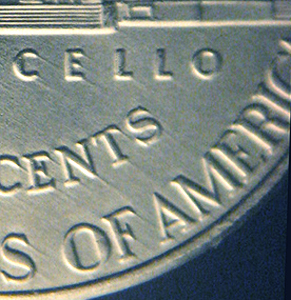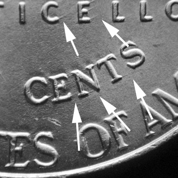 DESCRIPTION: Trail lines are seen from the bottom right corners of the LLO of MONTICELLO and the N of CENTS. This is a VLDS die and more trail lines maybe present on earlier die states. The offset direction is 140°.