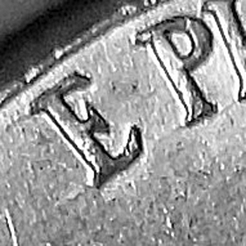 DIE MARKERS: Stage “B“, obverse is MDS – a small group of die gouges is seen below the word WE