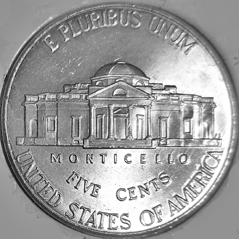 Reverse is MDS – a small die gouge is seen in between the letters US of PLURIBUS. Another small die gouge is seen to the left of one of the windows in Monticello.