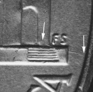 Reverse is MDS – a die crack that enters the field from the right eave of the Monticello building.