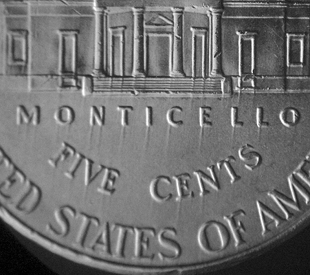 DESCRIPTION: Trail lines are seen on top of the letters US of PLURIBUS, the word UNUM, the right roof top of Monticello and the right bay windows. The offset direction is 010º.