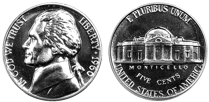 DESCRIPTION: Trail lines are seen on the E and P of EPU, the ERIC of AMERICA and the words FIVE CENTS. The offset direction is 270°. This is a proof coin and also considered to be a major trail die. The obverse die is identified as 1953S-5DEO-001T
