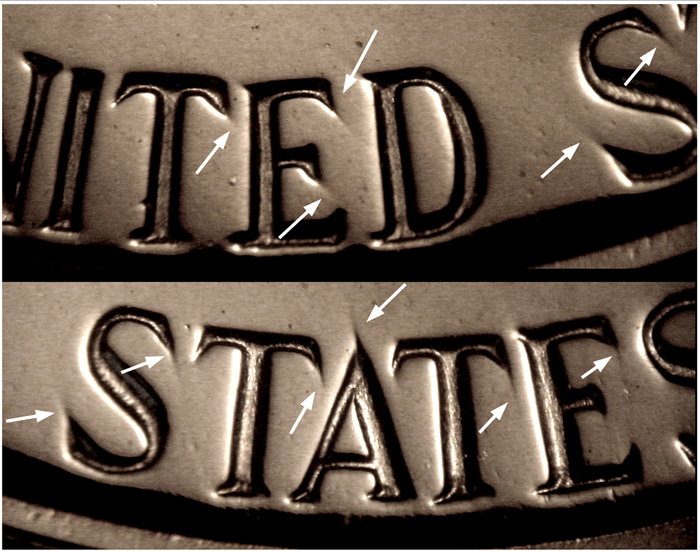 Description: Trail lines are seen from the ED of UNITED and the word STATES. There are two sets of trails that are a opposite of each other. One set has an offset direction of 000° while the other set is 180°. The images are courtesy of Richard S. Cooper.